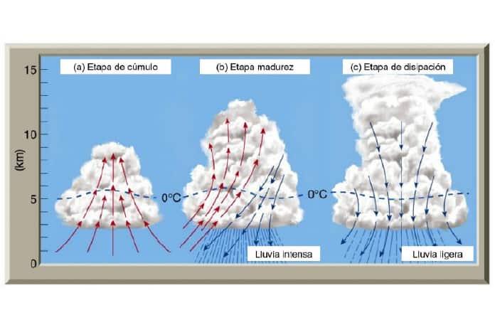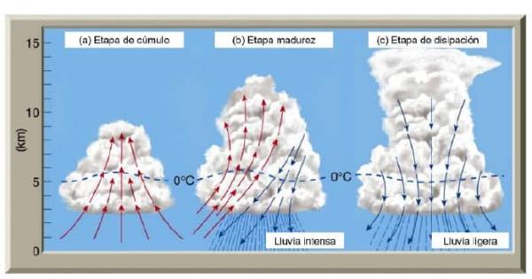 La cantidad de vapor de agua, que determina en buena medida la humedad de las masas de aire, puede variar significativamente de un lugar a otro. Ahora bien, una masa de aire con cierto contenido de humedad que se ve obligada a ascender experimenta una disminución de la temperatura con la altura dada por el gradiente térmico, que es de alrededor de -6.5 °C km. Para un determinado contenido de humedad a una cierta altura, el enfriamiento conduce a un cambio de fase, pasando de vapor de agua a agua líquida en forma de pequeñas gotas y formando las nubes. Este proceso se logra alcanzando el nivel de saturación, el cual es determinado cuando la humedad relativa alcanza el 100%. Es importante mencionar que para que una nube se forme, deben existir pequeñísimas partículas en suspensión para que la condensación se lleve a cabo, y dichas partículas son conocidas como núcleos de condensación. Una vez formadas las nubes y debido a diversas propiedades físicas del agua líquida, se puede generar precipitación. Si bien en este escrito no se tiene por objetivo describir tales procesos, es importante notar que la precipitación puede generarse a través del proceso de cristales de hielo o bien por el proceso de coalescencia.