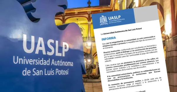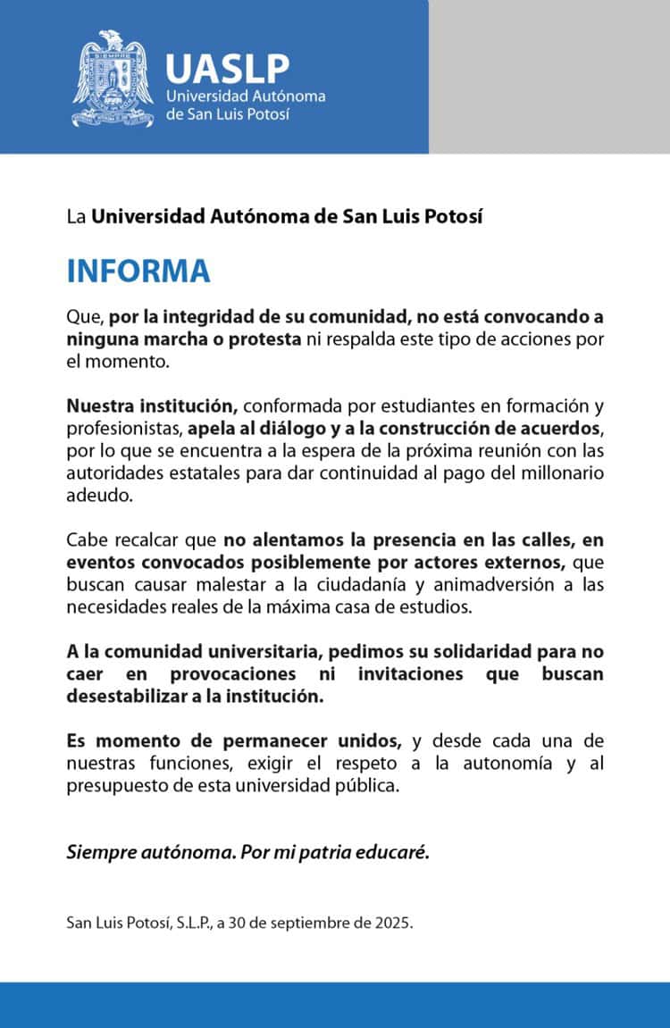 La Universidad Autónoma de San Luis Potosí (UASLP) aclaró que no está convocando ni respaldando marchas o protestas, y llamó a su comunidad a no caer en provocaciones ni en actos que busquen desestabilizar a la institución.