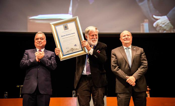 Al recibir al arquitecto Óscar Hagerman como parte de la comunidad de Doctores Honoris Causa de la UASLP, el rector Manuel Fermín Villar Rubio entregó la medalla y el titulo de Doctor Honoris Causa al galardonado.