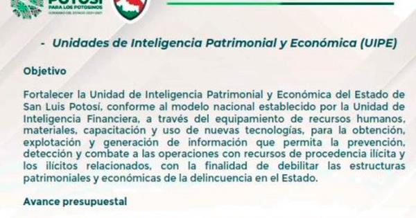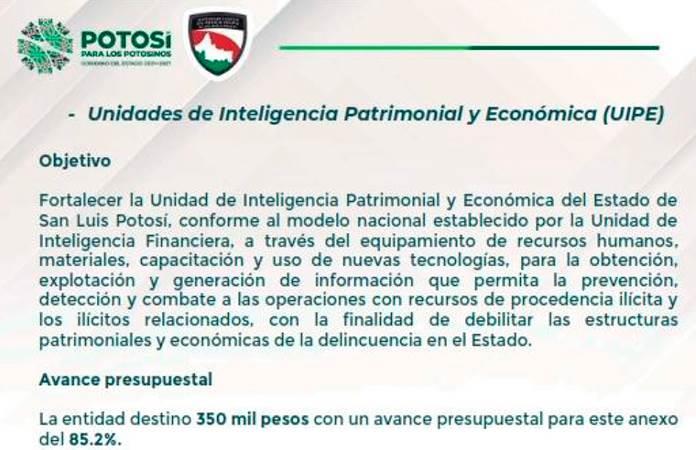 Con un presupuesto de origen federal de apenas 350 mil pesos durante el año pasado, la Unidad de Inteligencia Patrimonial y Económica (UIPE) del gobierno estatal no presentó una sola denuncia relacionada con hechos de uso de recursos de procedencia ilícita ante unidades administrativas de la entidad, sólo ante el órgano local de procuración de justicia.