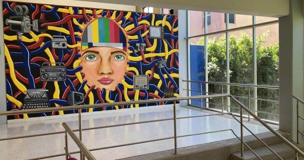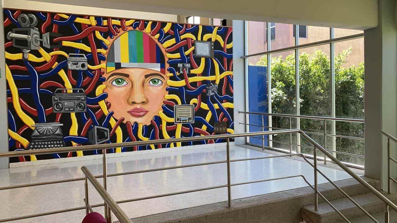 Andrea Michelle Martell Pérez, estudiante de octavo semestre, hace un reconocimiento a la comunicación analógica y a las herramientas de comunicación, tales como los dispositivos para el registro de audio y video, en un mural elaborado en el Centro de Producción Audiovisual.