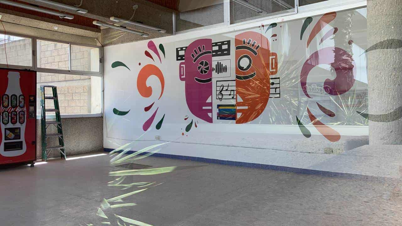 El segundo mural, pintado en la cafetería de la escuela, lleva por nombre "Unidos" y se refiere al distanciamiento social, derivado de la pandemia de coronavirus COVID-19 y las herramientas utilizadas para mantenerse comunicados.