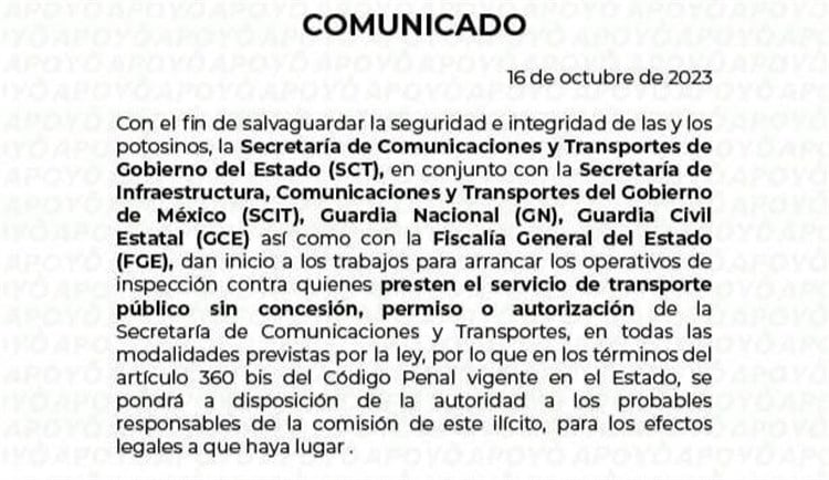 El comunicado advierte que se aplicará los dispuesto al artículo 360 bis del Código Penal del Estado, que tipifica el delito contra la prestación del servicio de transporte público sin ningún tipo de anuencia y que los responsables serán remitidos a la autoridad correspondiente.