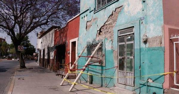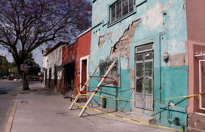En plena avenida Reforma, vecinos apuntalaron como pudieron una fachada que está a punto de derrumbarse, a unos metros del edificio de la Unidad de Gestión del Centro Histórico. Se trata de una casa vieja de adobe que por décadas no ha recibido mantenimiento.