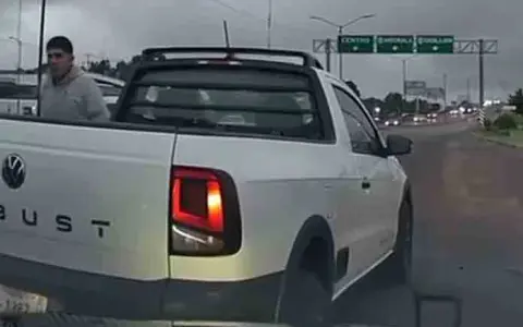 La camioneta le cierra el paso y obliga a la unidad perseguida a detenerse. El conductor, un hombre vestido con pantalón de mezclilla y sudadera gris, portando algo en su mano derecha, baja del vehículo y camina hacia el perseguido.