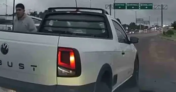 El vehículo lo evita y adelanta y justo antes de incorporarse en el carril central, la camioneta intenta de nueva cuenta la maniobra.