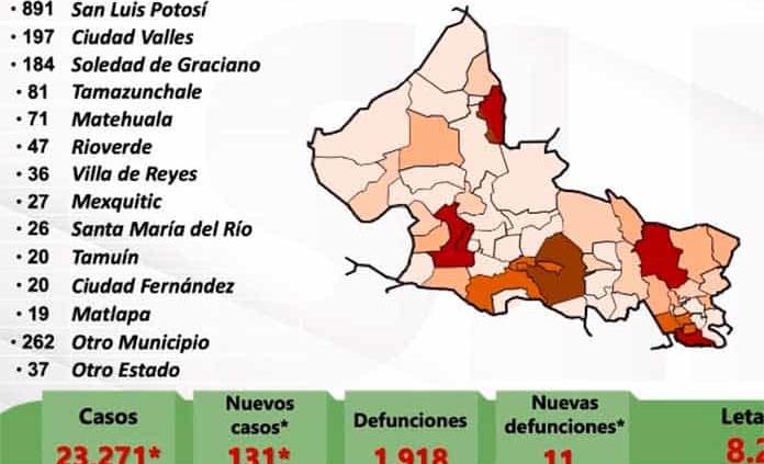 San Luis Potosí acumula hasta este sábado 23,271 casos de coronavirus, tras confirmarse 131 nuevos contagios en las últimas 24 horas.