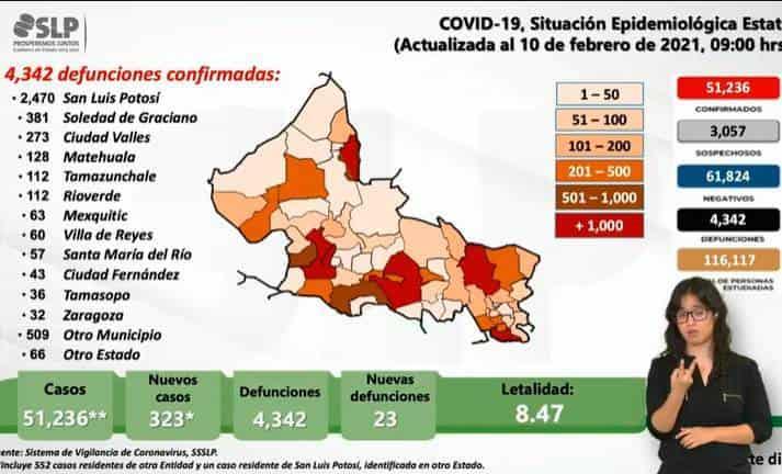 De las 23 defunciones, 11 corresponden a hombres y 12 mujeres; 12 tenían residencia en la capital, 6 en Soledad, 1 en Matehuala, Rioverde, Zaragoza, Ciudad Fernández y Villa Juárez, y tenían morbilidades de hipertensión arterial, edad, diabetes y obesidad.