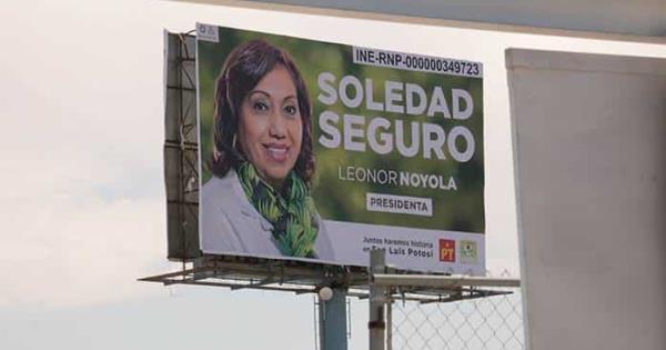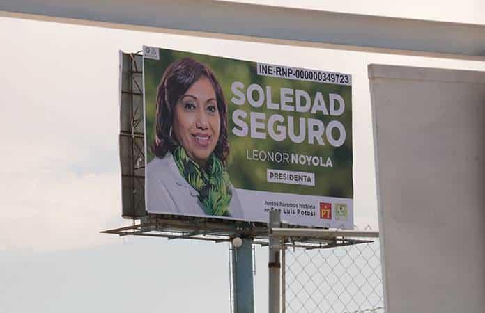 En las carreteras a Matehuala y a Rioverde, ya aparecen espectaculares con la imagen de Leonor Noyola candidata por la coalición “Juntos Haremos Historia” de los partidos Verde Ecologista de México y del Trabajo.