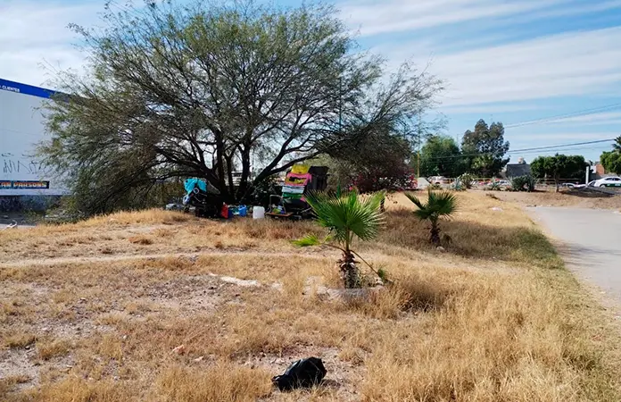 Esta persona, que al parecer pernocta en algo similar a un carro choza, acumula algunas pertenencias a un lado del bulevar. Sin duda, un caso para la investigación del Sistema Municipal DIF de Soledad.
