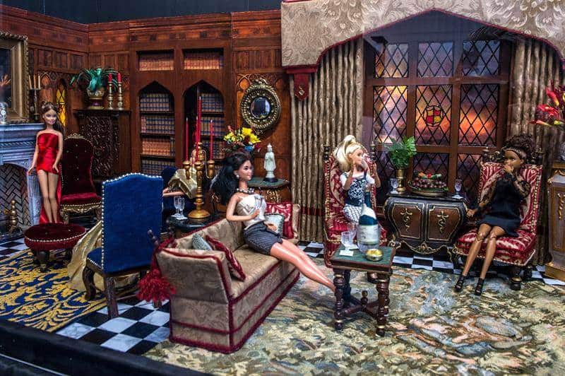 Una de las vitrinas, que se vende por 10 mil dólares, muestra una escena de un cumpleaños en el salón de una gran mansión de estilo inglés con muchas muñecas elegantemente vestidas, que tiene un aire a la serie televisiva "Dinasty".