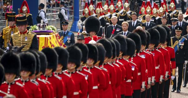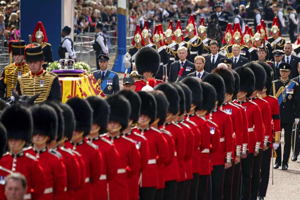 Ya desde por la mañana se podían ver interminables filas de personas de todas las edades y distintos lugares del mundo portando ramos de flores -mayoritariamente girasoles- con tarjetas decoradas y mensajes de despedida, caminando, en un ambiente de respeto, hasta la avenida de The Mall, por donde luego desfiló la procesión hasta el Parlamento.