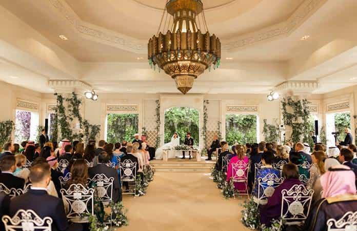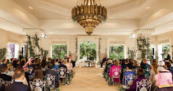 Al término de la ceremonia matrimonial, el príncipe heredero Husein y su mujer Rajwa abandonaron los jardines del Zahran para poner rumbo al palacio de Al Huseiniye, donde tiene lugar la celebración del banquete con 4,000 invitados, a quienes se les ha proporcionado un servicio de autobuses gratuito para su traslado.