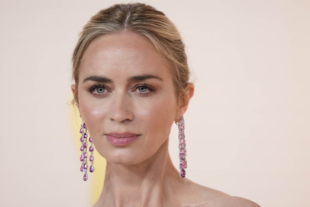 Unos delicados pendientes de oro blanco engastados de zafiros rosas de Chopard han sido la mejor opción para el vestido blanco de Emily Blunt, quien también ha lucido un anillo de platino con un diamante de casi once quilates.