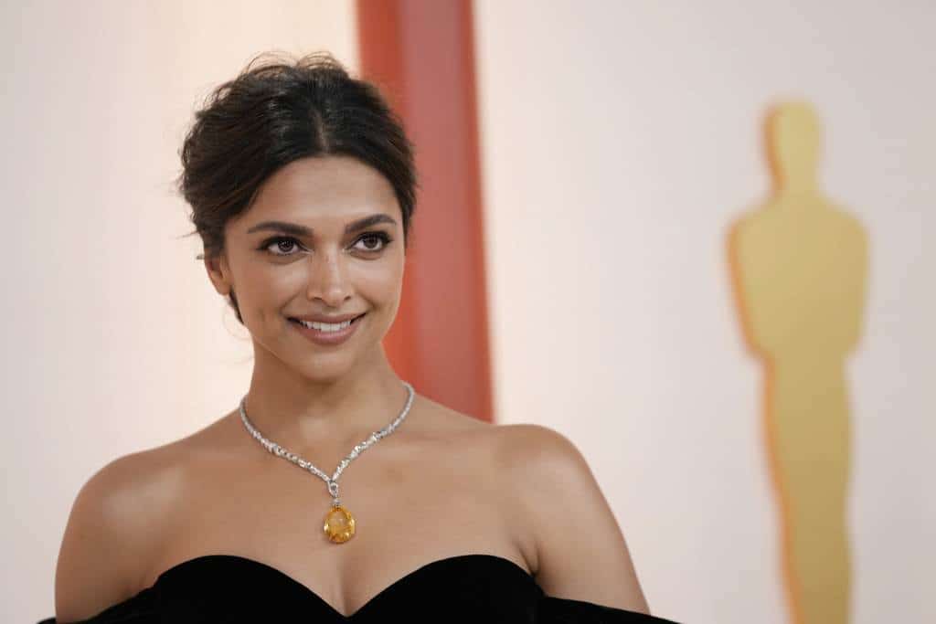 La modelo y actriz danesa de origen indio de la industria de Bollywood, Deepika Padukone, ha elegido un collar de Cartier con un gran zafiro amarillo, en oro blanco y diamantes blancos y amarillos, una pieza de gran belleza como el collar de brillantes de Zoe Saldaña.