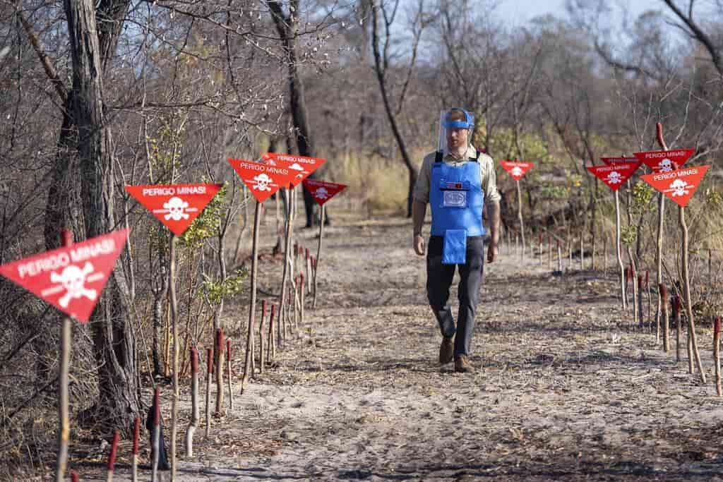 "Este campo de minas aquí, en el Parque Nacional de Luengue-Luiana, es el primero de 153 que será limpiado en los dos parques nacionales del sudeste de Angola", dijo el duque de Sussex, de 35 años.