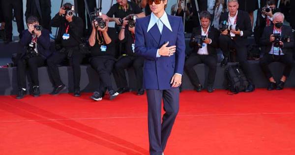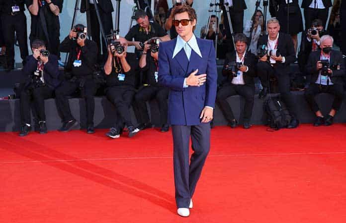 Styles llegó con todo a la alfombra roja de Venecia luciendo un traje azul marino de Gucci con hombreras y una camisa de solapa muy grande, dijo la editora ejecutiva digital de Harper's Bazaar Sarah Karmali a The Associated Press.
