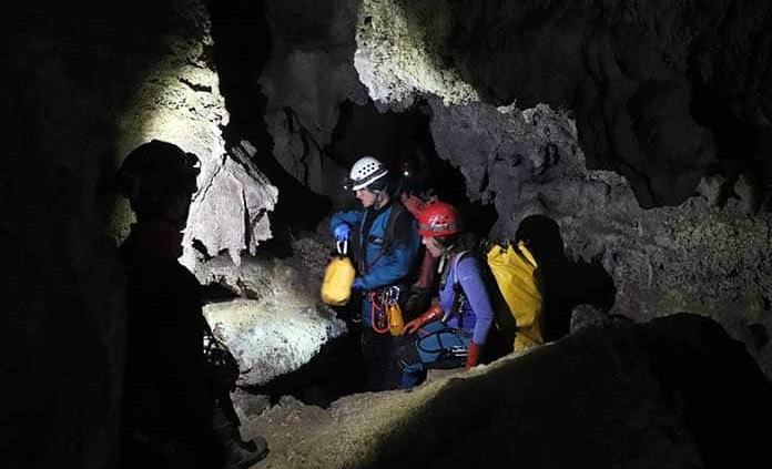 Al descender a las entrañas de la tierra son recibidos por oscuridad y algunas gotas de agua que caen del techo adornado por estalagmitas. Así comienza el viaje. El equipo de espeleólogos trabajará por unas cinco horas, caminando, adecuando los pasadizos y haciendo anotaciones exactas de la altura, clima y elevación de cada parte del terreno por el que pasen.