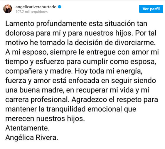 La ex primera dama y actriz de telenovelas Angélica Rivera anunció este viernes que tomó la "dolorosa" decisión de divorciarse de Enrique Peña Nieto, presidente de México entre 2012 y 2018.