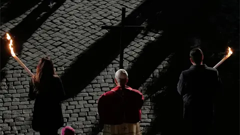 Dentro del Coliseo, León levantó la cruz y comenzó el rito flanqueado por dos portadores de antorchas, que lo acompañaron durante la procesión de una hora desde el interior del Coliseo, a través de la multitud afuera y luego por unas empinadas escaleras hasta el monte Palatino, donde dio la bendición final.