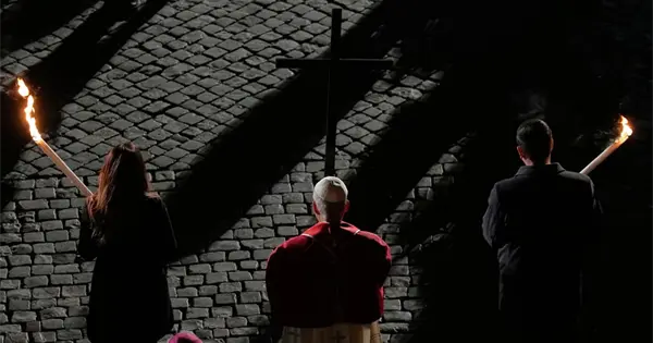 El vía crucis conmemora las últimas horas de la vida de Jesús, desde su condena a muerte y el momento en que toma la cruz hasta su crucifixión, muerte y sepultura. La procesión termina fuera del Coliseo, en lo alto del monte Palatino.