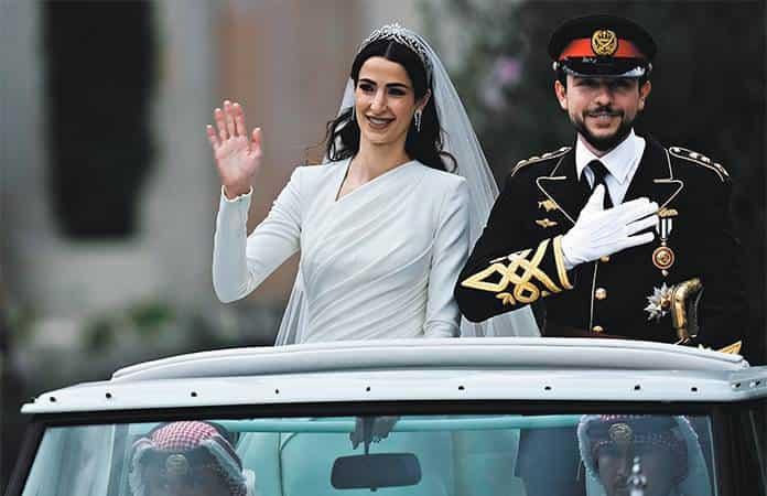 Más tarde, los recién casados salieron del palacio en una camioneta Range Rover blanca personalizada, escoltados por varios Land Rover de color rojo brillante, motocicletas y una banda de música militar, un guiño a las tradicionales procesiones a caballo durante el reinado del fundador del país, el rey Abdula I.