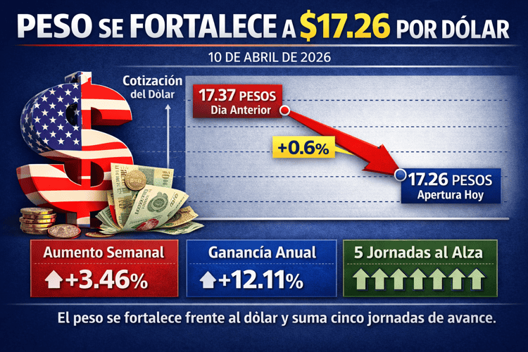 El tipo de cambio arrancó este 10 de abril con una clara tendencia a la baja para el dólar, que se ubicó en 17.26 pesos por unidad, consolidando una racha negativa frente a la moneda mexicana.
