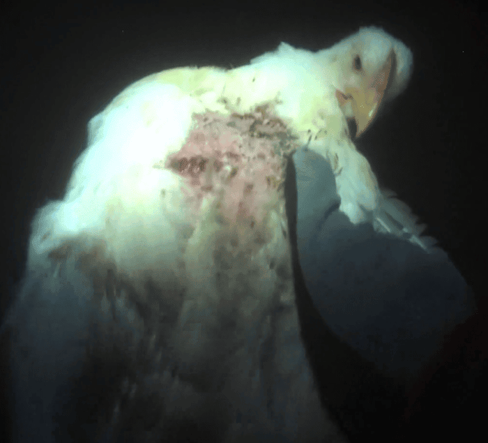 "A las gallinas les crecen pechos enormes, porque esa es la carne que quieren los consumidores, por lo que las patas de las aves a veces se abren o colapsan. Algunos se caen de espaldas y luego no pueden levantarse. Otros pasan tanto tiempo boca abajo que a veces sufren erupciones sanguinolentas y furiosas llamadas quemaduras por amoníaco; estas son una versión de las úlceras de decúbito de aves de corral", cuenta.