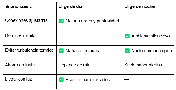 Quien logra dormir en cabina saca ventaja del nocturno: llegas y aprovechas el día. Si te cuesta conciliar el sueño sentado, un despegue matutino rinde mejor porque tu energía va completa y la adaptación horaria resulta más amable.