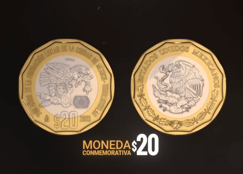 La pieza mexicana de 20 pesos fue fabricada en polímero en colores rojo y verde, con el tema de la consumación de la Independencia con el Ejército Trigarante.