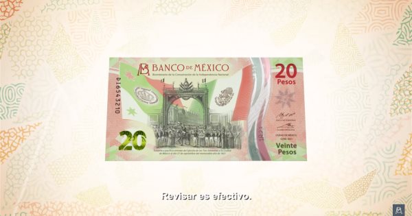 Se trata del nuevo billete de 20 pesos elaborado en polímero multicolor predominantemente verde y rojo de la familia G conmemorativo del Bicentenario de la Consumación Independencia.