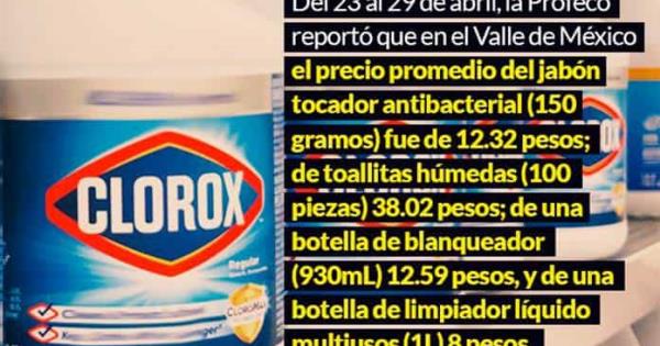 De la semana del 23 al 29 de abril, la Profeco monitoreó que en la Ciudad de México y área Metropolitana el precio promedio de un jabón tocador antibacterial (150 gramos) fue de 12.32 pesos; de toallitas húmedas (100 piezas), 38.02 pesos; de una botella de blanqueador (930mL), 12.59 pesos; y de una botella de limpiador líquido multiusos (1L), 8 pesos. La Profeco no proporciona el precio de cubrebocas ni desinfectantes en aerosol.