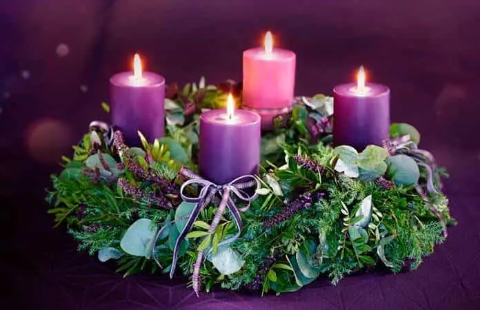 Tres velas son moradas (símbolos de penitencia y preparación), y una de color rosa (símbolo de alegría del tercer domingo, también conocido como "Gaudete", que significa "alegraos" en latín por la llegada del nacimiento de Jesús).