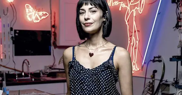 Maldonado creó un gramófono tridimensional de cristal luminoso inspirado en los icónicos letreros de neón de Las Vegas y rodeado de coloridas flores.