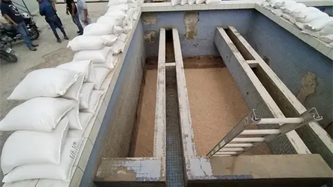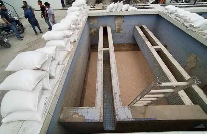 CIUDAD VALLES.- Colocan zeolita en el filtro 1 de la Dapas para evitar que haya agua marrón en días de lluvia. La colocación comenzó hace unos días y continuará por varios más.