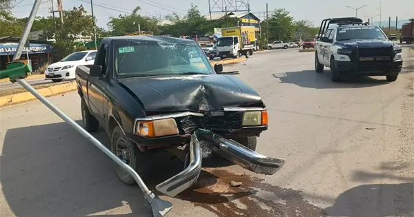 Para evitar el impacto, el conductor maniobró, pero terminó subiéndose al camellón y chocando contra un poste de alumbrado público, el cual fue derribado desde la base.