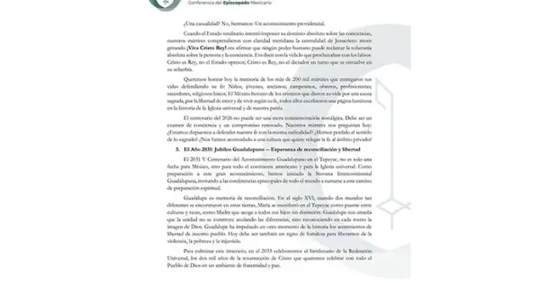El documento de los obispos de México recordó la proclamación de Cristo Rey y la siguiente “Ley Calles” que impedía la práctica del culto católico a una buena parte de la población “que desató la persecución religiosa más cruenta de nuestra historia.”. A la Cristiada, el CEM le llama “Resistencia Cristera” y agrega que “Cuando el Estado totalitario intentó imponer su dominio sobre las conciencias nuestros mártires comprendieron con claridad meridiana la mentalidad de Jesucristo: morir gritando ‘¡Viva Cristo Rey!’ (...) Era decir con la vida lo que proclamaban con los labios: Cristo es Rey, no el Estado opresor; Cristo es Rey, no el dictador en turno que se envuelve en su soberbia”.