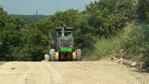 CIUDAD VALLES.- Máquina pesada con rótulos del excandidato a la Presidencia, José Luis Romero, "Tecmol", habría roto una tubería de alta densidad en avenida Universidad, causando daños en decenas de colonias.