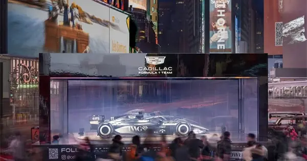 Cadillac F1 colocó el coche el viernes pasado en el centro de la plaza de Times Square en una gran instalación de cristal completamente tapada y esperó hasta el domingo a las 22:30 hora local, tras el final de la Super Bowl, para destapar el diseño del nuevo monoplaza.