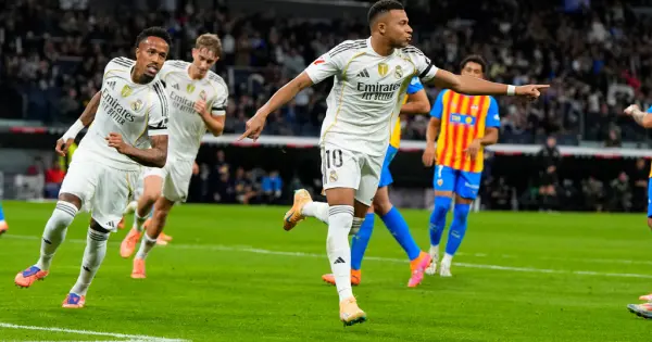 El Real Madrid logró, con un doblete de Kylian Mbappé y goles de Jude Bellingham y Álvaro Carreras, su triunfo más plácido de la temporada en LaLiga, 4-0 al Valencia, y aumentó la presión sobre el Barcelona, que se enfrenta al Elche con una desventaja de ocho puntos.