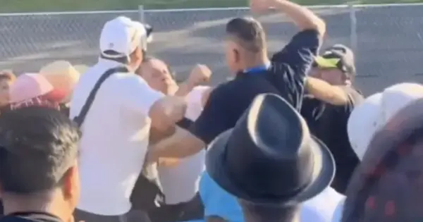 En un video difundido en redes sociales se observa cómo un sujeto con playera blanca y otro con playera negra comienzan a golpearse. La pelea se intensificó al caer ambos al suelo, mientras varios asistentes intentaban separarlos.