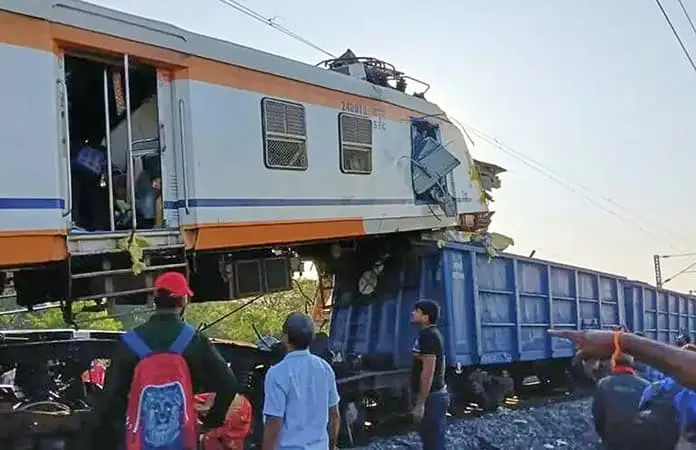 El tren local de pasajeros impactó al tren de carga por detrás, y un vagón terminó encima de un carro del tren de carga, comentó Sanjay Agarwal, el alto funcionario del gobierno, a The Associated Press.