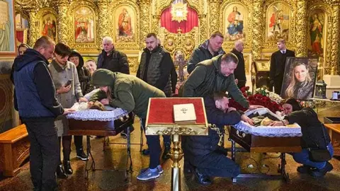 Los dos periodistas, que a menudo trabajaban juntos, fueron despedidos lado a lado durante un servicio fúnebre en el Monasterio de San Miguel de las Cúpulas Doradas, donde sus ataúdes estaban cubiertos con rosas frescas.