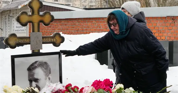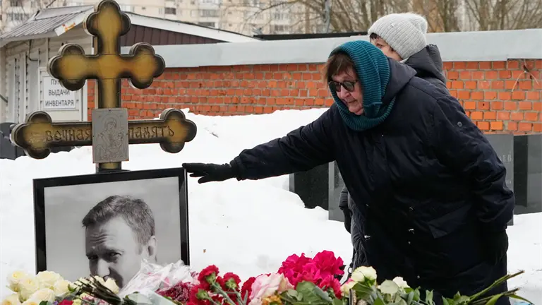 La madre de Navalny, Lyudmila Navalnaya, y la suegra del líder opositor, Alla Abrosimova, estuvieron entre los dolientes que depositaron flores en su tumba. Un montículo de ramos se elevaba por encima de los espesos bancos de nieve que cubrían el cementerio Borisovsky de Moscú.
