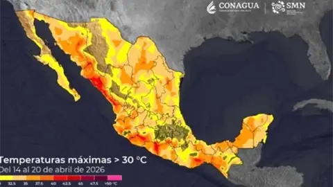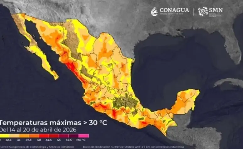 La Comisión Nacional del Agua (Conagua), a través del Servicio Meteorológico Nacional (SMN), advirtió que del miércoles 15 al lunes 20 de abril se pronostica un incremento de las temperaturas máximas en la mayor parte del país, alcanzando 40 a 45 °C en zonas del litoral del Pacífico mexicano.