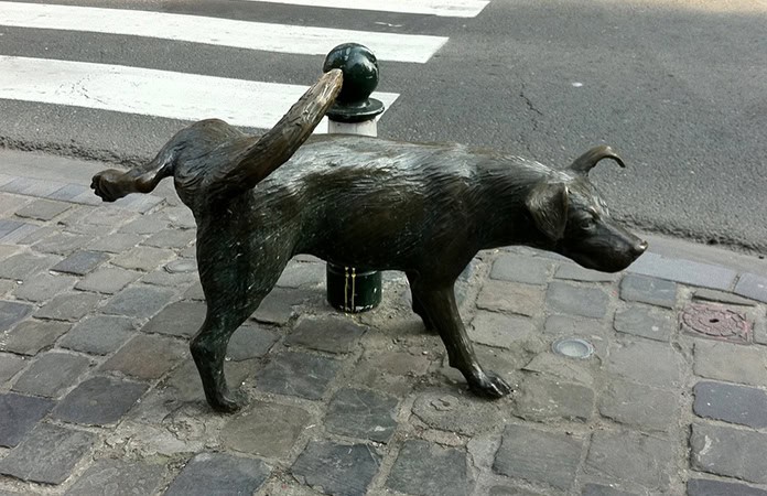 Naturalmente existe otra versión: de que quien lo hizo fue un perrito, por lo cual se hizo otra escultura ahora del animalito.