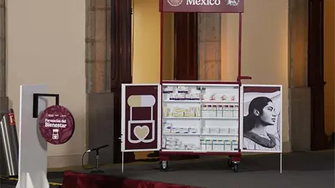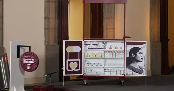 “Para que no tengan que entrar al centro de salud, a hacer la fila que normalmente hay para las farmacias, entonces va a ver afuera de los centros de salud y la próxima semana inicia en las Tiendas del Bienestar un módulo como estos donde van a poder recoger sus medicamentos. Este pequeño módulo es lo que llamamos Farmacias del Bienestar.