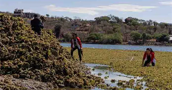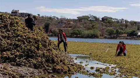 Huajuapan, Oax.- Niñeces, jóvenes, mujeres, hombres y familias completas se citan antes de las 7:00 de la mañana para retirar la lechuguilla acuática o lechuga de agua, que ha invadido por completo la presa de Yosocuta, en Huajuapan de León, Oaxaca.
