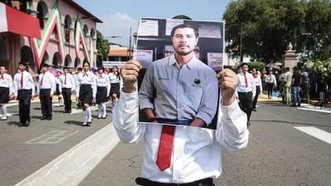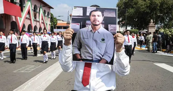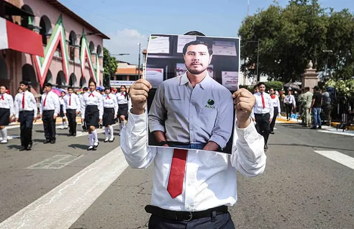 Apatzingán, Mich.- Estudiantes, maestros y políticos protestaron este miércoles en Apatzingán por el asesinato del líder de los citricultores, Bernardo Bravo Manríquez, en medio de la principal celebración del municipio.