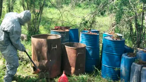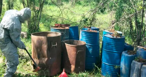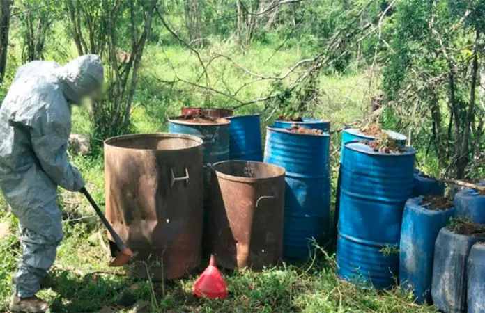 CIUDAD DE MÉXICO, 16 de octubre (EL UNIVERSAL).- Autoridades federales localizaron e inhabilitaron un área de concentración de material diverso para la elaboración de metanfetamina, aseguraron mil 850 litros de sustancias químicas en Cosalá, Sinaloa, en el poblado Estancia de Los García.